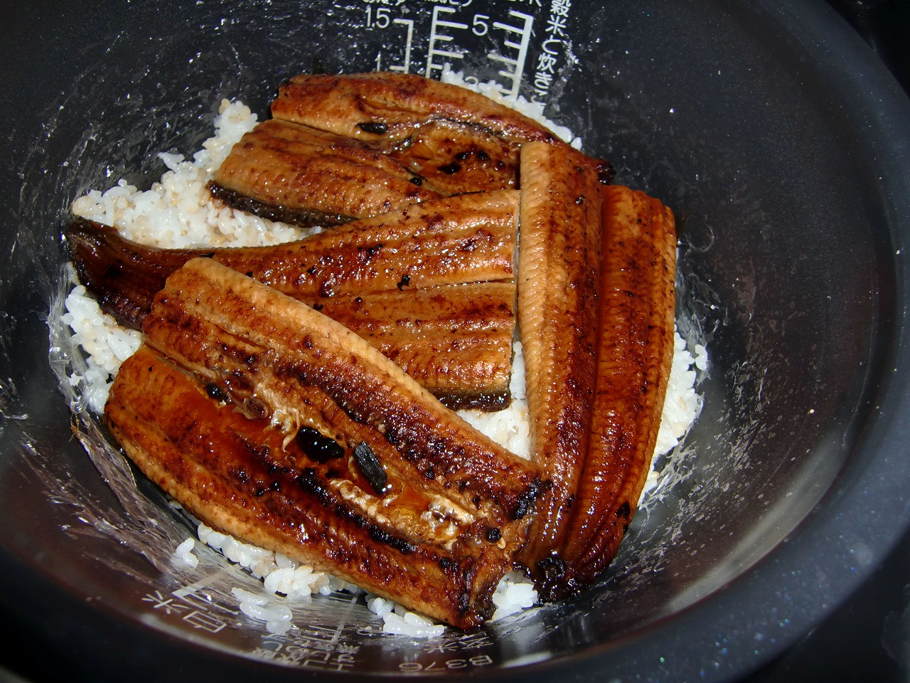 炊飯器のご飯は蒲焼のタレがついてしまいますから、全部食べるのではなければ蒲焼を入れる前に余分なご飯を取ってからにしてください。
