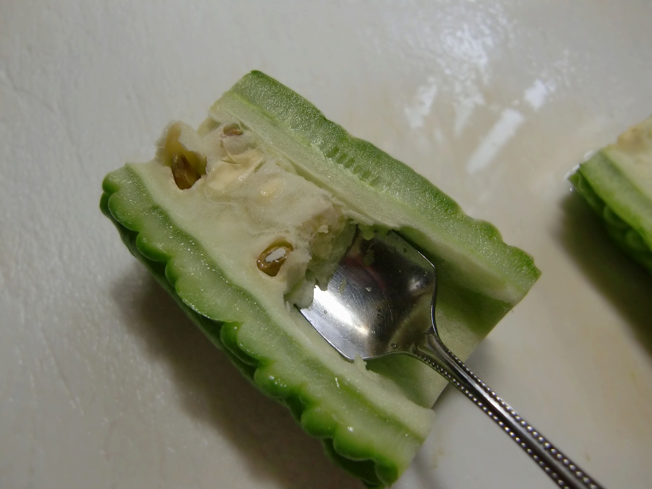 1.まず、適当な大きさに切って、半分にします。中のワタをスプーンでかきとります。