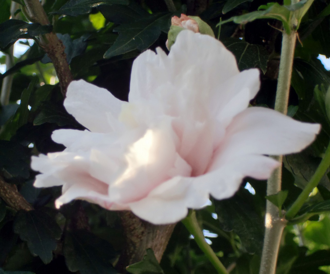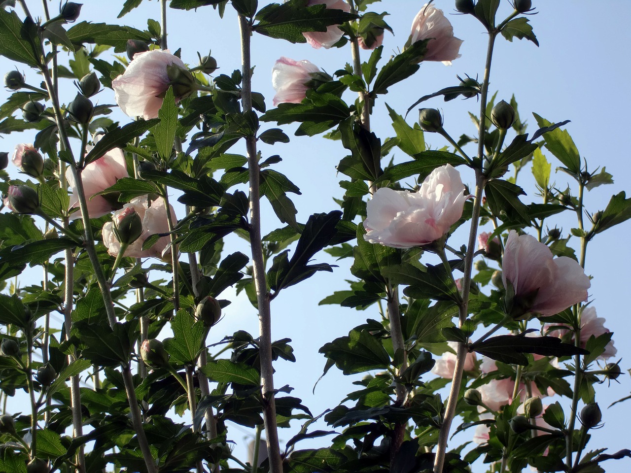 これはムクゲ。夏から秋にかけて次々と咲いてくれる落葉樹です。丈夫な花木ですが、うっかりしているとアブラムシがついてせっかくの花がきたなくなってしまいます。咲く前にオルトラン剤などで、防止しておきます。