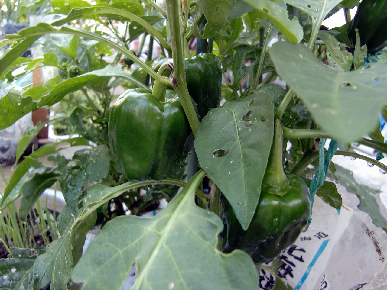ピーマンがもう成っています。初め虫に葉を食べられていましたが、復活してちゃんと実が成りました。これは袋栽培で育てたピーマンです。