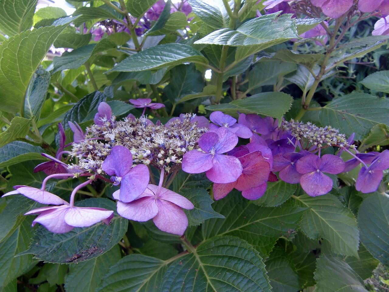 品種はガクアジサイとホンアジサイがあります。我が家のはガクアジサイだと思います。真ん中にある両性花を取り囲むように装飾花があることから、ガクの様に見えるためガクアジサイと呼ばれます。