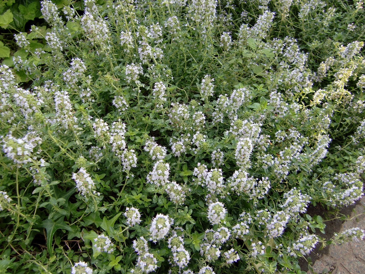 これはタイムの花。葉は料理に、特に肉や魚の香り付けに時々利用しています。白い小さな花が今時期は咲いています。