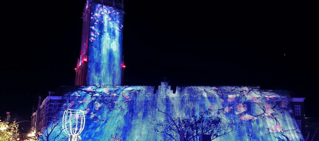 色とりどりに光っているのは、映像と光を組み合わせて作られているみたいです。水が流れているような映像なのですが、いつも同じ色でなく、その時々で色が変わっていきます。