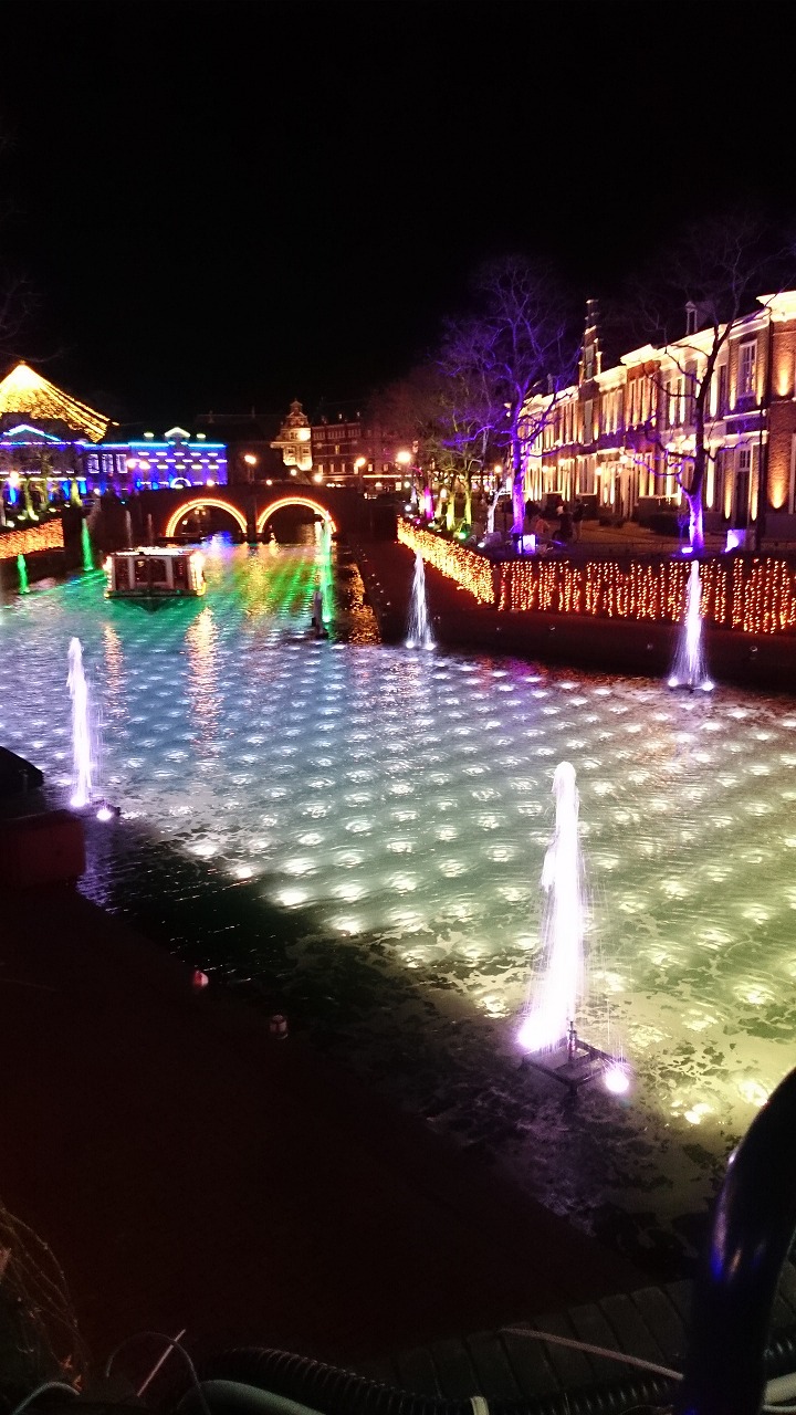 ハウステンボスの中に川が流れているんですけど、ここさえ光と噴水で楽しませてくれるんです。音と映像と光を組み合わせて作られているようです。