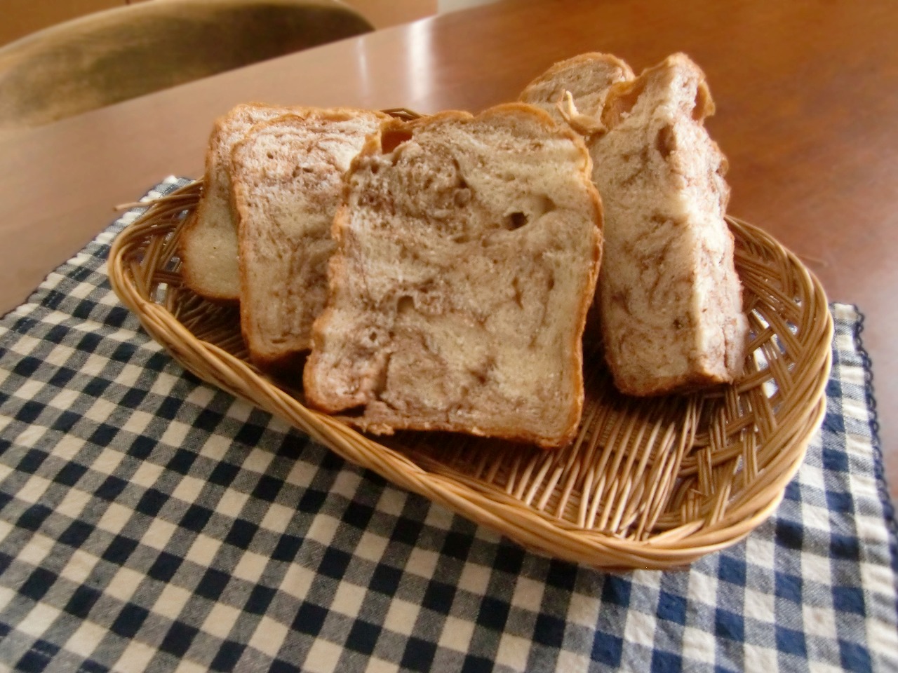 チョコレートソースのマーブル模様が出来ていますね。チョッピリ甘い食パンとなりました。
