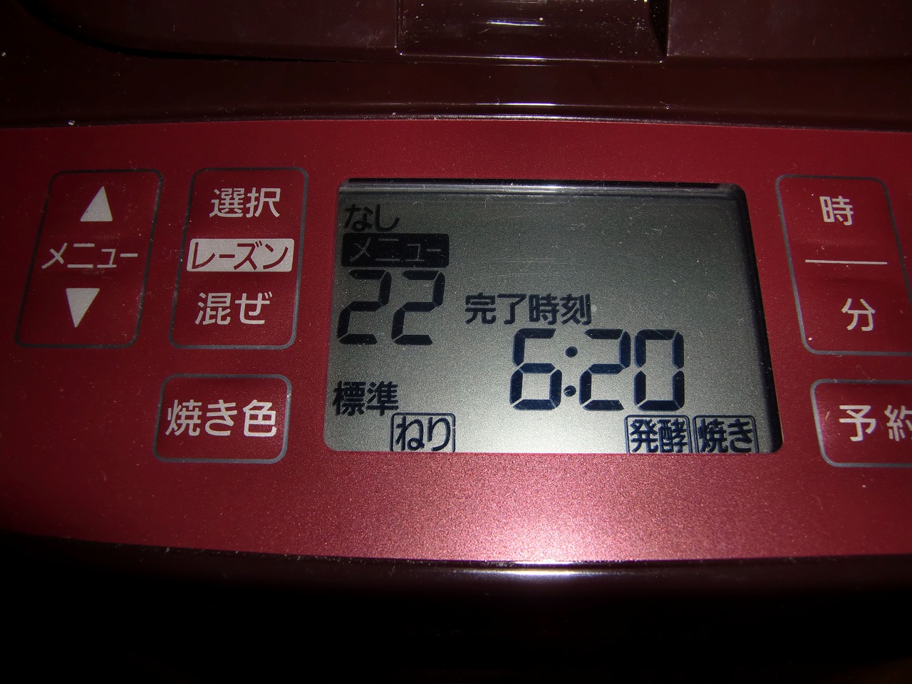 3.メニュー「22」、今回は追加材料がありませんので、レーズンなし、焼き色標準にセットしました。焼き上がりに時間がかかるので、タイマーをセットしました。