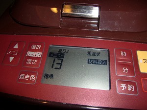 2.メニュー「13」、レーズンあり、粗混ぜでスタート。