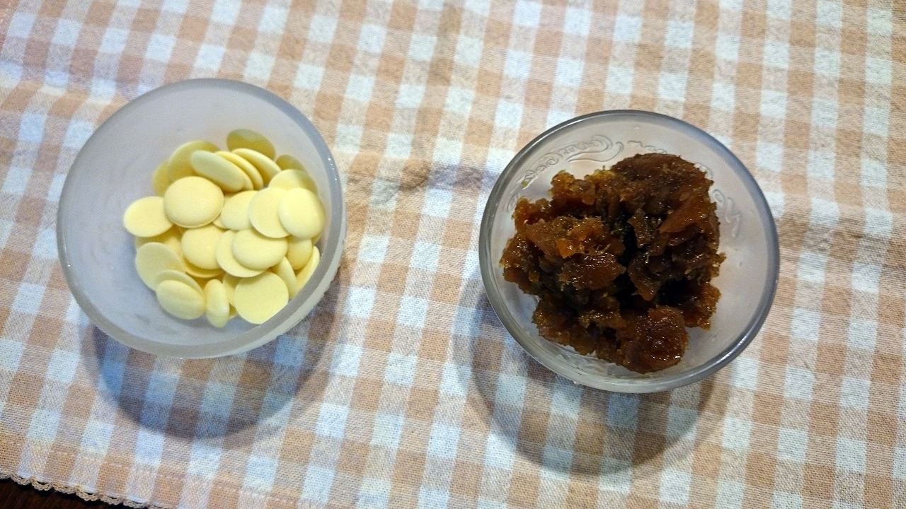 3.ピピと鳴ったら、ダイダイとホワイトチョコを入れる。ホワイトチョコは今回マーブル型なのでそのまま入れます。