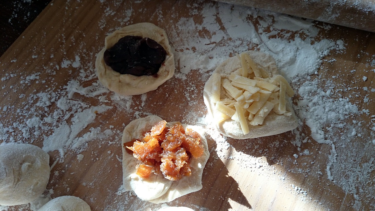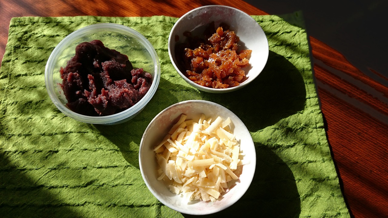 *具材は自由ですが、今回は練りあん、ダイダイジャム、チーズを使いました。家にある身近な具材で良いと思います。