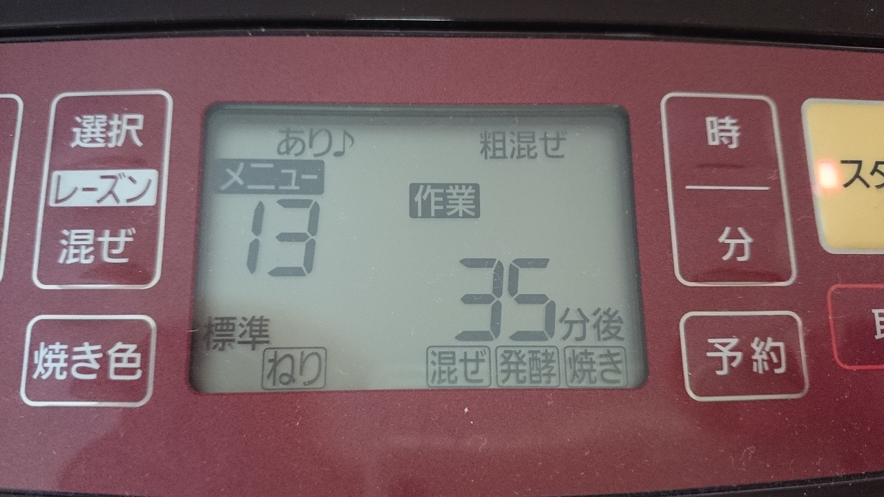 2.ドライイーストはイースト容器に入れ、メニュー「13」、レーズンあり、粗混ぜでスタートします。