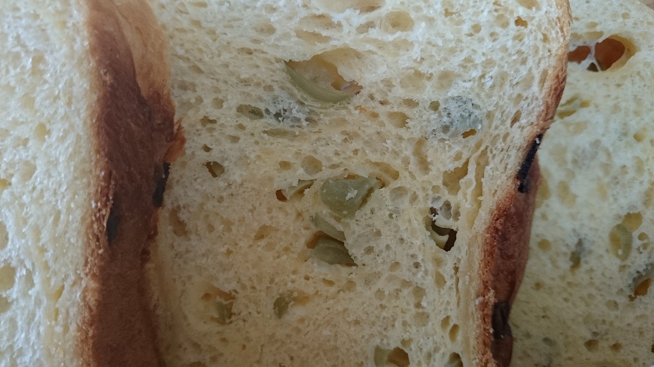 緑色が梅の実です。卵が入るので黄みがかかったパンになります。
