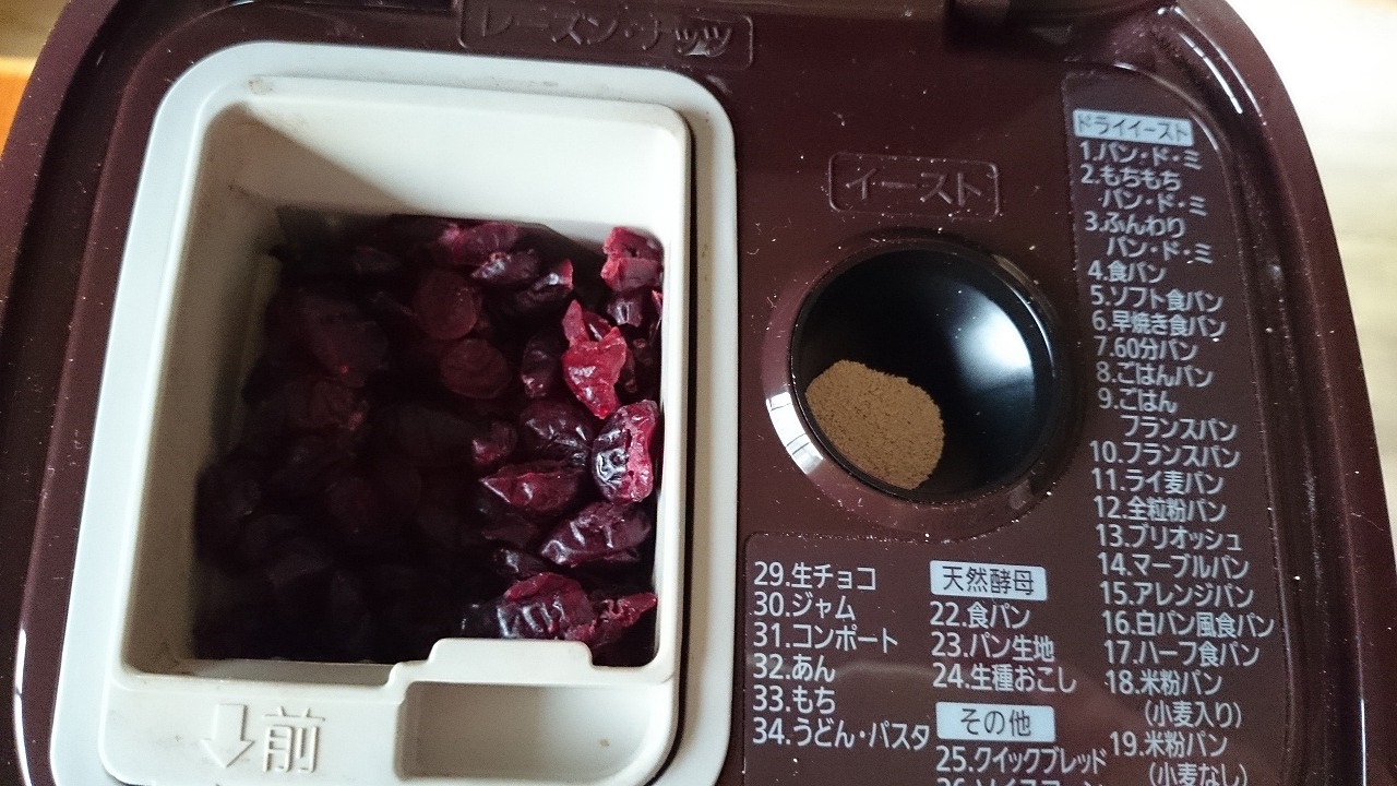 2.ドライクランベリーはレーズン容器に、ドライイーストはイースト容器に入れます。