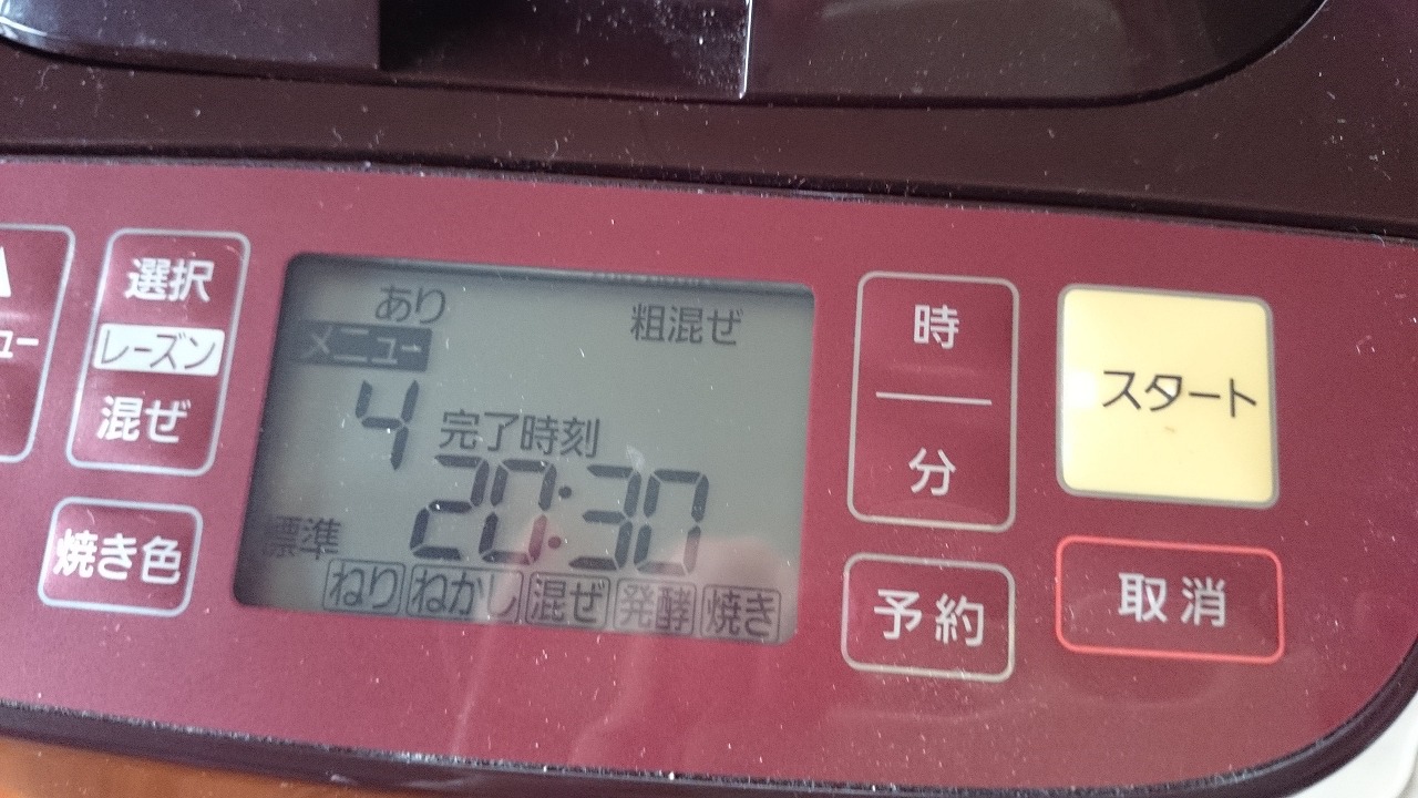 3.メニュー「4」、レーズンあり、自動、粗混ぜ、スタートします。今回は普通の食パンコースで焼きました。