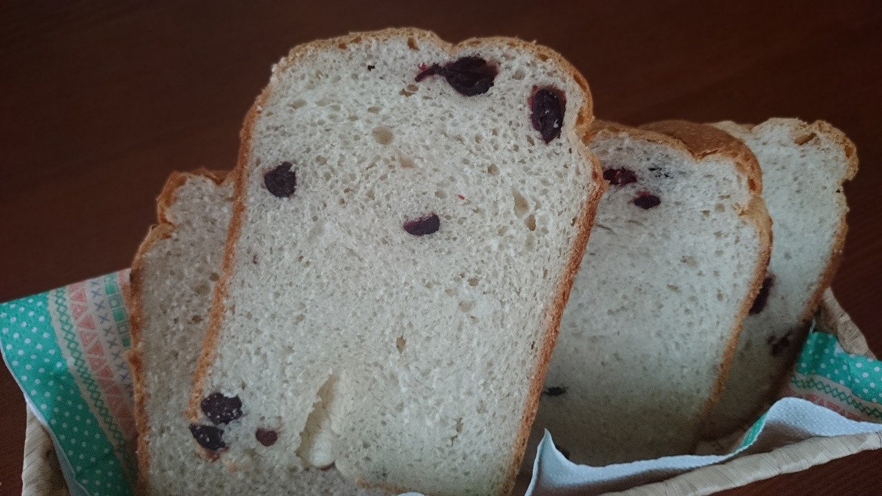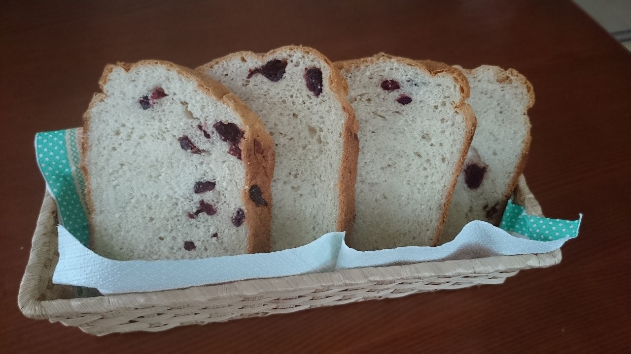 焼くコースによっても味わいが変わってくるかと思いますが、一般の食パンコースでもとっても美味しく焼けました。生クリームのまろやかさとドライクランベリーの甘酸っぱさが何ともいえない味になりました。美容と老化防止に良いドライクランベリーで美味しいパンを作ってみませんか。ぜひお試しくださいね。