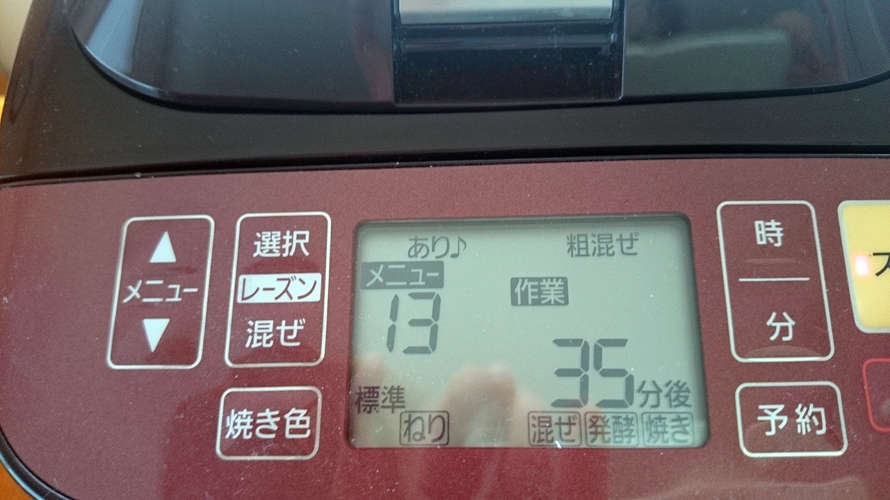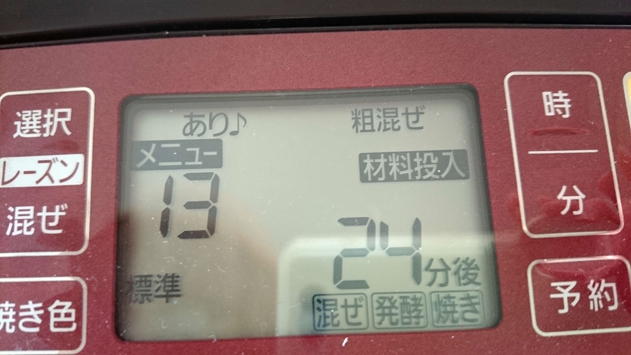 2.ドライイーストはイースト容器に入れ、メニュー「13」、レーズンあり、粗混ぜでスタートします。