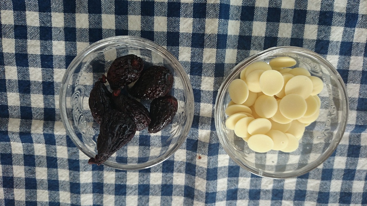 ドライイチジクはキッチンハサミで小さく切っておきます。ホワイトチョコは今回マーブルタイプを使用したのでそのまま使いました。
