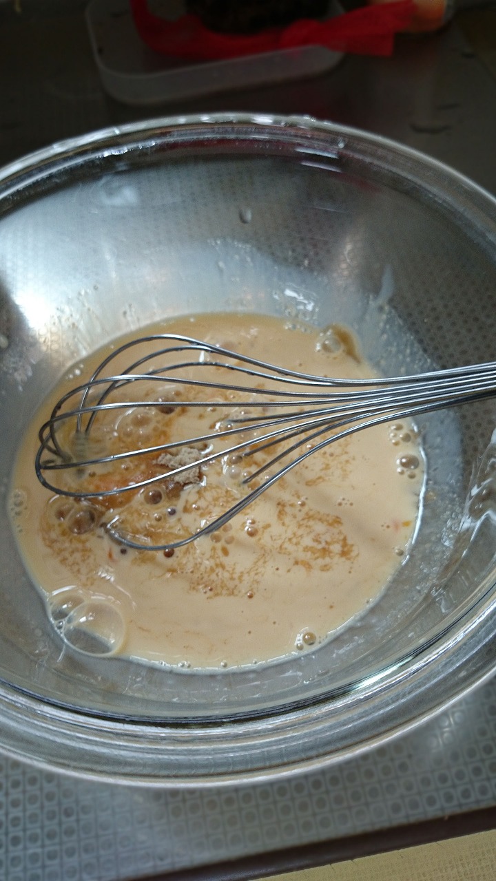 2.ボールに卵液と砂糖を入れ、よく混ぜます。泡立て器を使った方がなめらかになります。