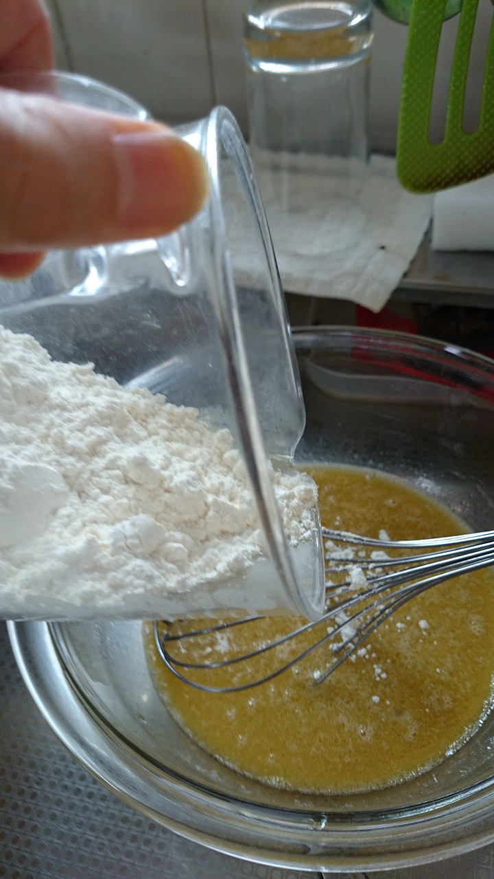 5そこへふるった薄力粉とベーキングパウダーを加えて良く混ぜます。ここが肝心、なめらかになるまで良く混ぜることです。