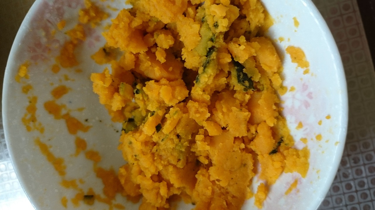 4.予めつぶしておいたかぼちゃを加えます。レンジなどで軽く柔らかくしておくとつぶせます。