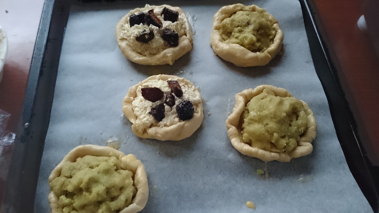 パン生地を作って成型し、蒸したサツマイモを熱いうちにつぶしてハチミツと豆乳あるいは牛乳、生クリームなどで軽くあえておきます。