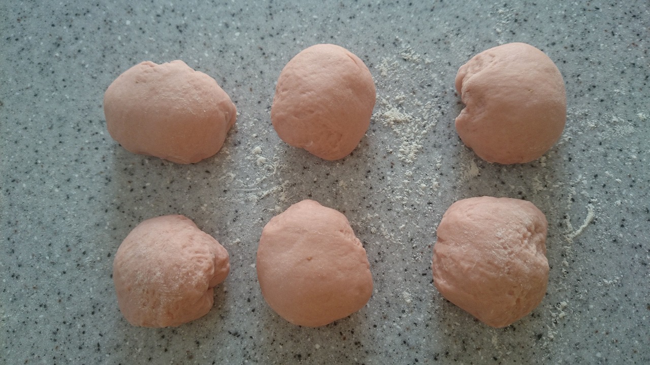 2.生地が出来上がったら、スケッパーで6個に分け、それぞれ丸めておきます。