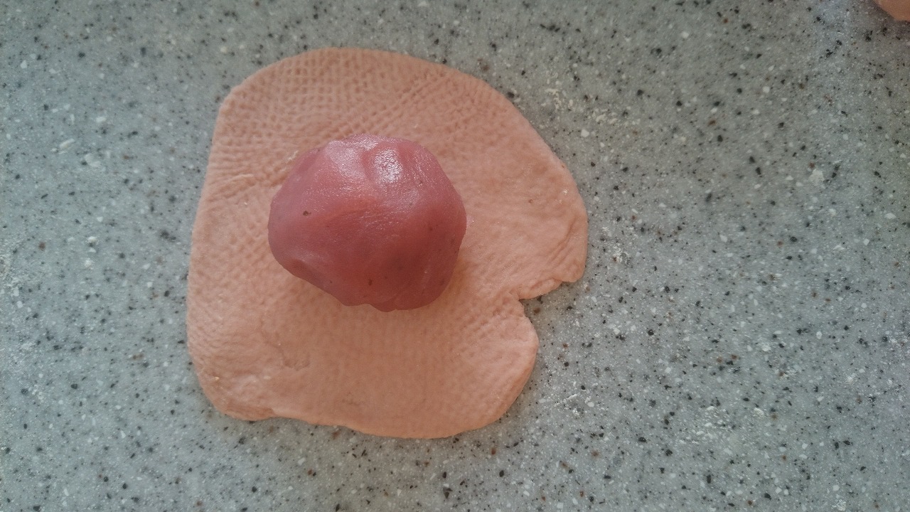 4.休ませたら、成型します。手の平で押してから麺棒で少し伸ばします。餡子が入るくらい。