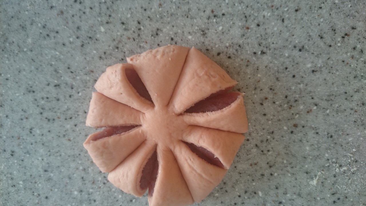 8.切り込みの隣同士の生地をひっくり返して桜餡が見えるようにします。