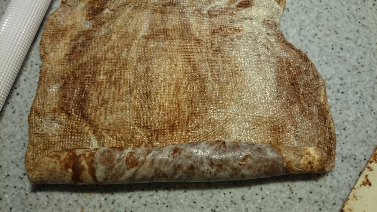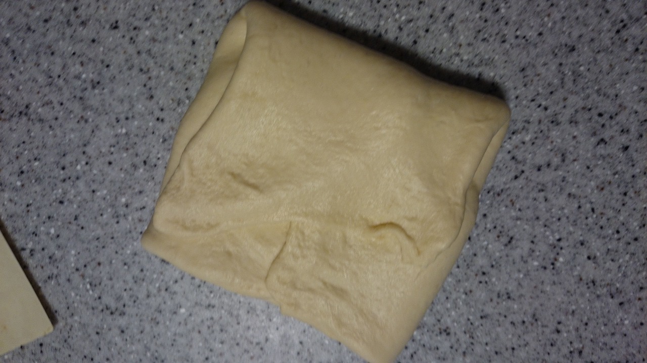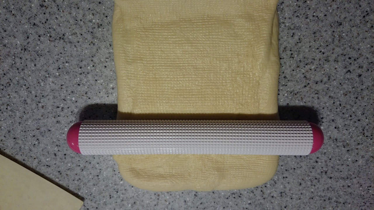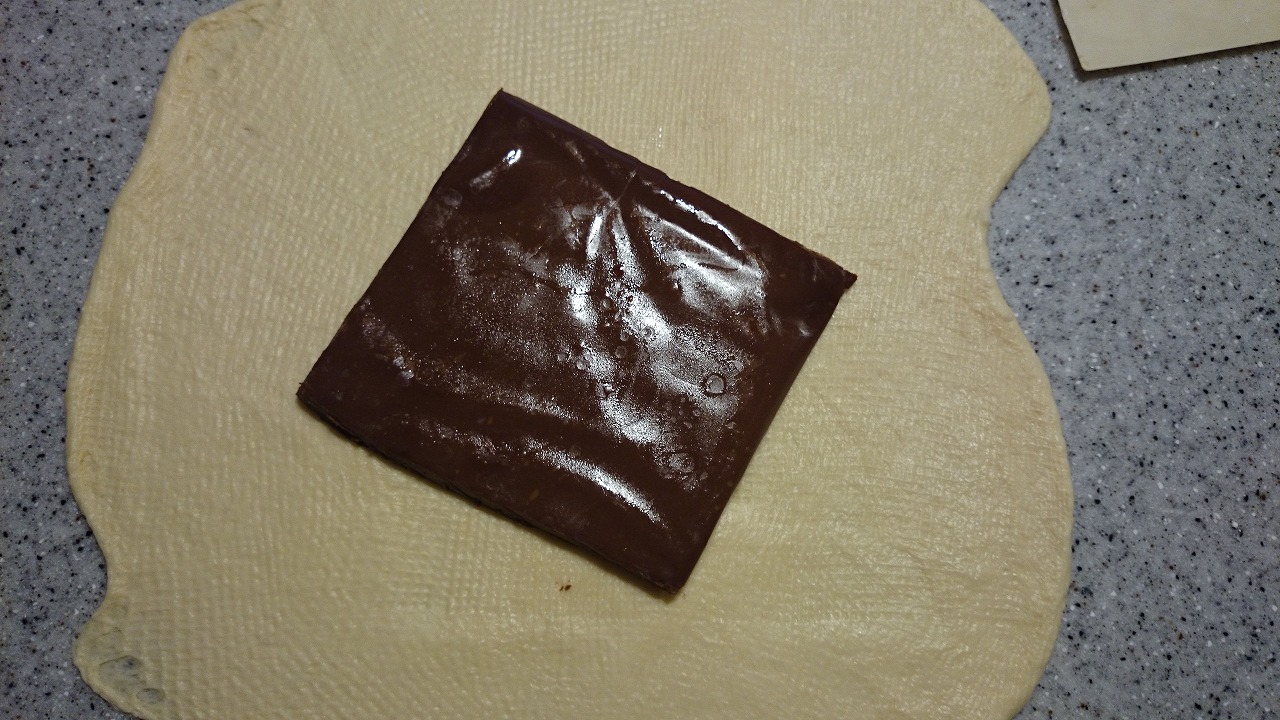 11.先程と同じように麺棒で伸ばします。これを3回ほど繰り返します。途中、チョコが飛び出してしまう事もありますが、あまり気にせず行います。