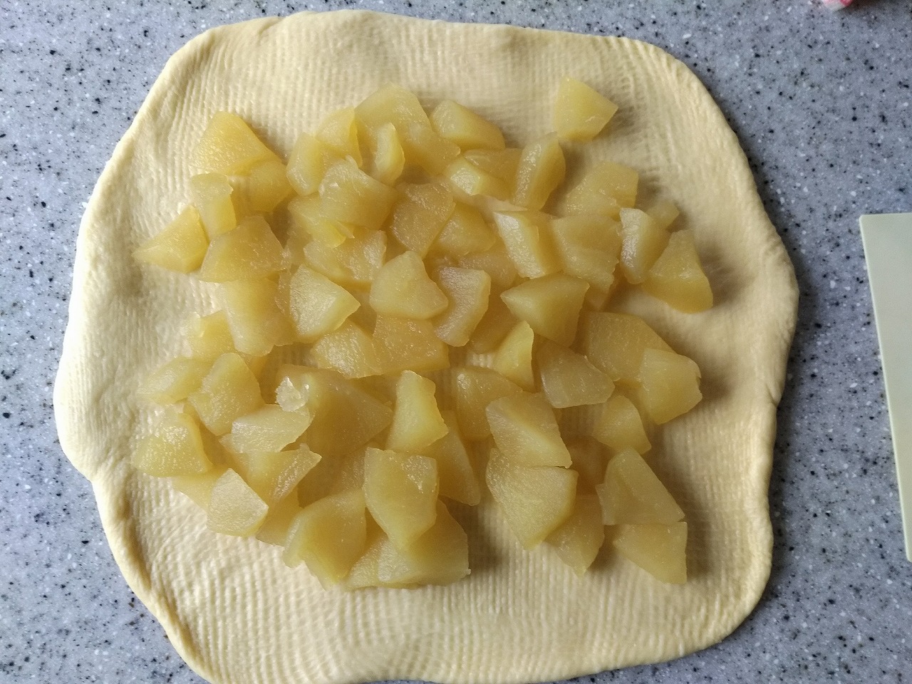 5.ベンチタイムが終わったら、麺棒で伸ばし、冷蔵庫あるいは冷凍室に保存してあるりんごの甘煮をのせます。