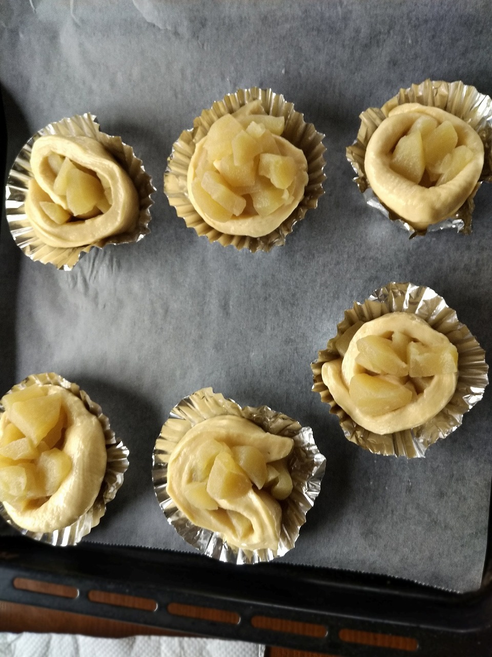 7.6個に切り分けます。切り分けた生地をりんごが見えるように倒し、アルミのカップに置きます。