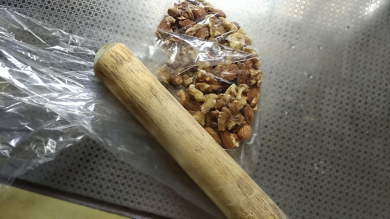 香ばしくローストしたナッツ類を小さく砕いておきます。