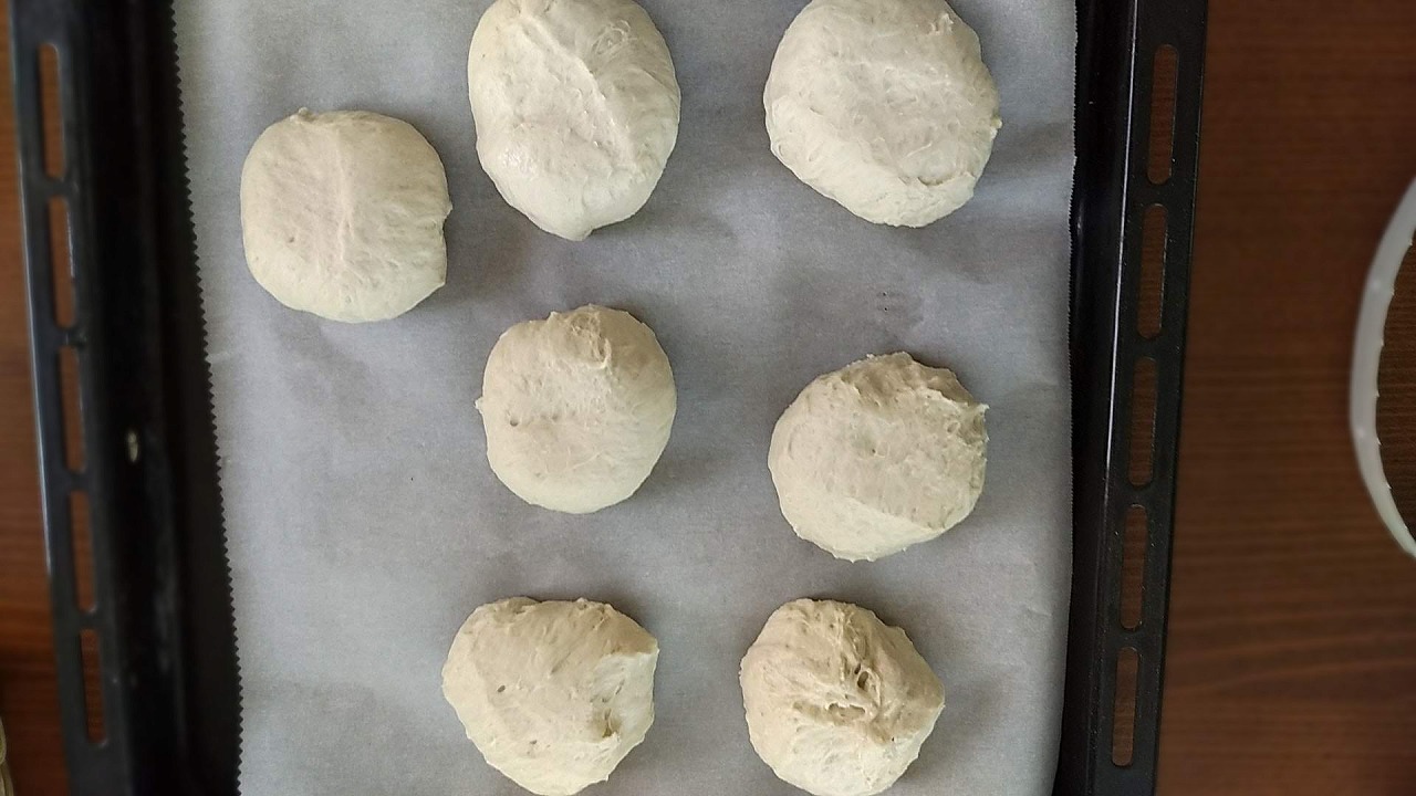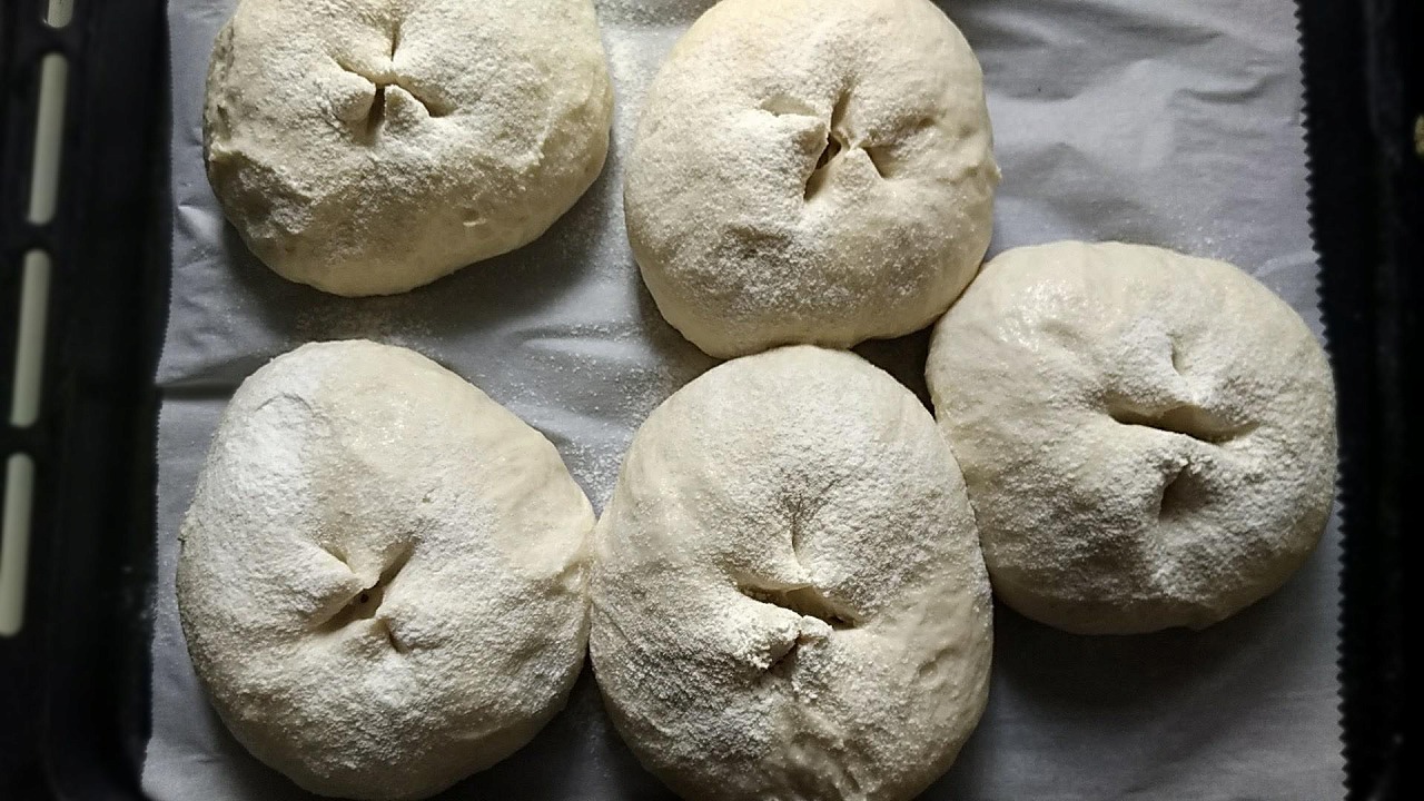 3.生地が出来上がったら、7個に分け、それぞれ丸めて濡れ布巾をかけ、12分休ませます。