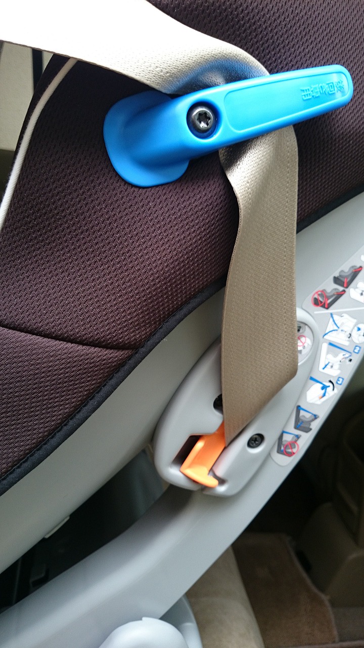 付ける場所は運転席の後ろです。後ろ向きに取り付けます。シートベルトを長く引っ張って下から通して差し込みます。