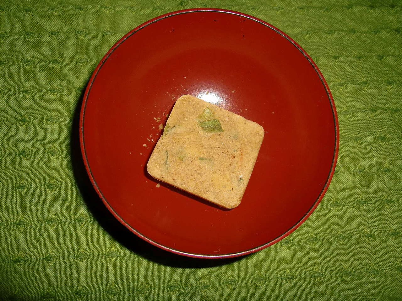 早速、「根菜のおみそ汁」を食べてみます。袋を開けると四角い乾燥したみそ汁が出てきますので、お椀に入れます。